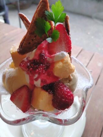 2026-2-22いちごミルフィーユパフェ いちごのほかにあんまりフルーツがないので いちごのパフェをもうひとつ。 カタラーナ(というかカスタードクリームを冷凍して) とフレッシュのいちご、ザクザクに焼いたミルフィーユ風のパイ。 まさにミルフィーユっていうか、ナポレオン。